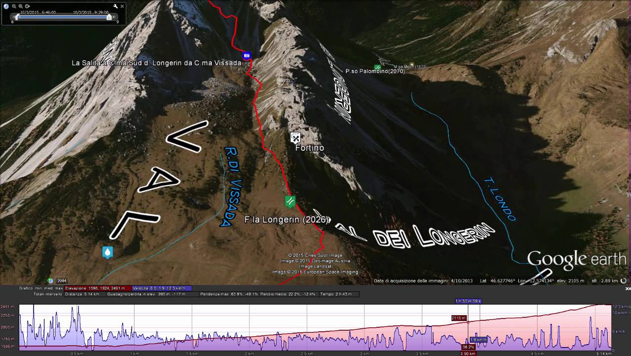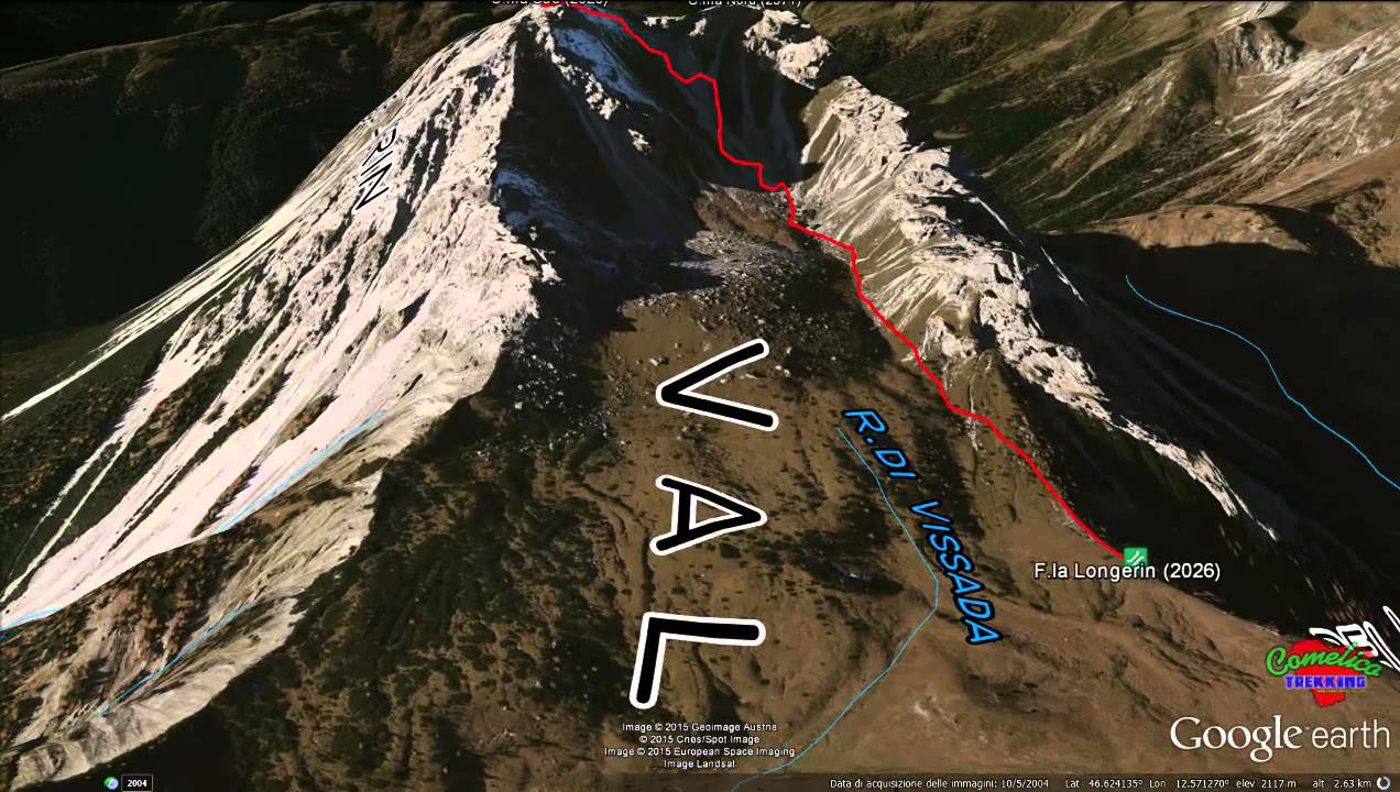 .da S.la dei Pradetti Da Sud-Ovest le C.de d. Longerin possono essere affrontate partendo dalla Sella dei Pradetti. Questa via prevede dapprima l’attraversata del M. Zovo. Si puo’ salire dall’abitato di Costalissoio e, dopo aver lasciato l’auto in localita’ La Baita, si continua a salire su strada forestale asfaltata e ripida lungo il Bosco dei Giavi fino a raggiungere (1610 m s.l.m.) ed attraversare il Coston di Sasso Grigno (1834 m s.l.m.); da qui si passeggia in falso piano avvicinando il M. Zovo fino a raggiungere il bivio per Costa (1896 m s.l.m.) dove si scende in direzione Nord-Est fino alla quota di 1757 m s.l.m. della Sella dei Pradetti, percorrenza 10min in auto e 1h30min a piedi (6,2Km e 7,7Km). Alla Sella dei Pradetti si puo’ salire anche dall’abitato di S. Nicolo’ di Comelico. In automobile si raggiunge Costa, fraz. di S. Nicolo’, e si sale per boschi di abeti lungo una strada asfaltata fino a raggiungere la localita’ Fronta’ (1573 m s.l.m.), percorrenza 16min-8,8 Km. Abbandonata l’auto si sale per prati lungo una strada sterrata fino al bivio per Costalissoio, sotto la cima del M. Zovo (1896 m s.l.m.), da qui si scenda alla Sella dei Pradetti (1757 m s.l.m.), percorrenza 1h-4,3Km.